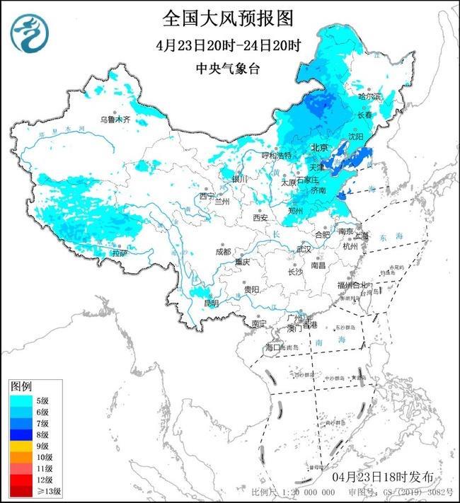 预计,4月23日20时至24日20时,内蒙古中东部、黑龙江西北部、吉林中西部、辽宁、河北北部和东部、北京西部山区、天津、山东、河南中东部、江苏北部等地有5~6级、阵风7~9级的大风,其中,内蒙古东部部分地区平均风力可达7级、阵风10级;渤海、渤海海峡、黄海北部海域将有7级、阵风8~9级的大风。